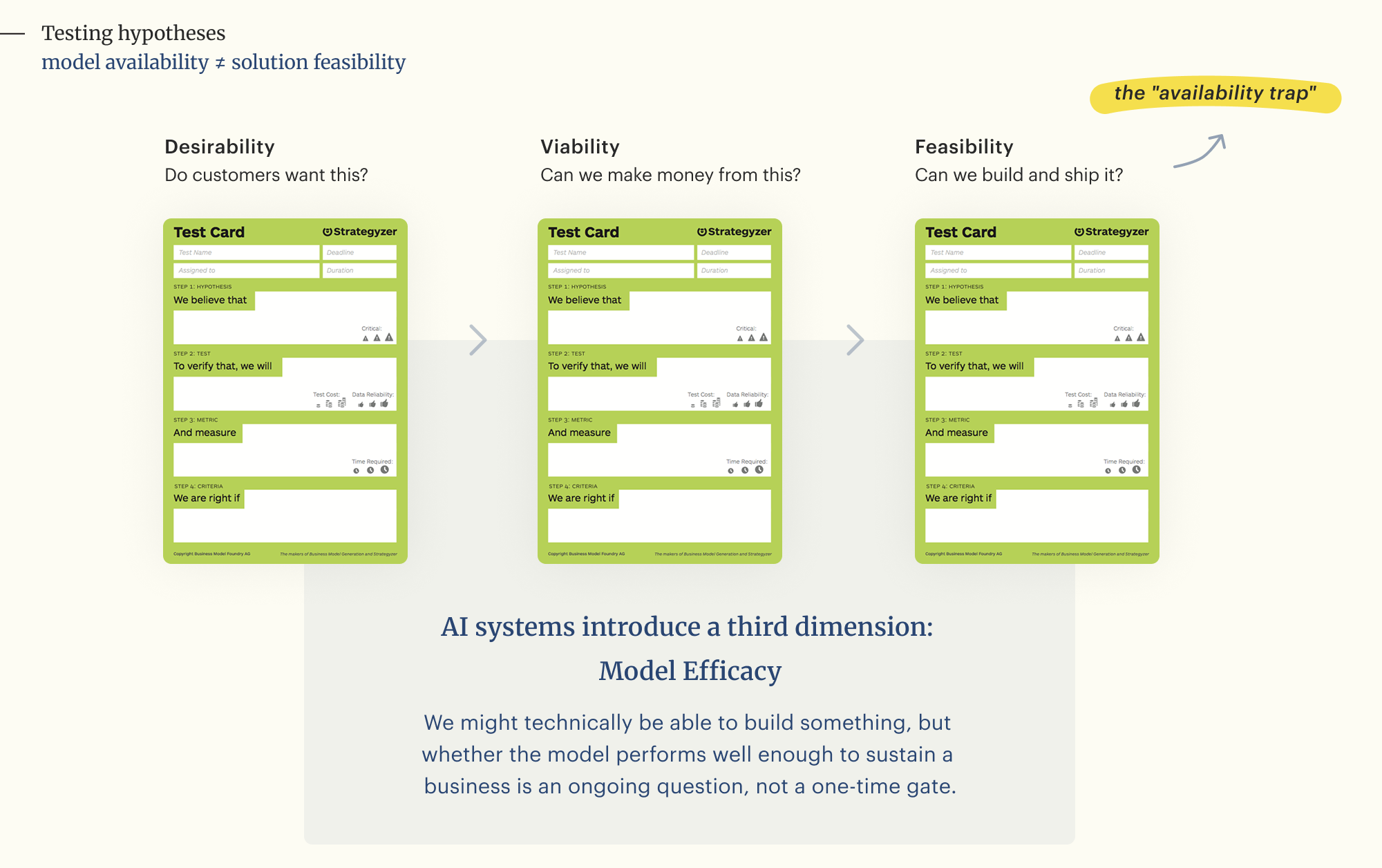 The current feasibility test card validates the existence of the engineering pipeline, yet it fails to prove that the input data holds the predictive patterns required to generate accurate outputs. Treating validation as a static checkpoint neglects the reality that guardrails are safety mechanisms rather than competence generators. If the raw model requires cost-prohibitive engineering chains or human intervention to function correctly, the product may technically work while failing the unit economics required for a viable business model.