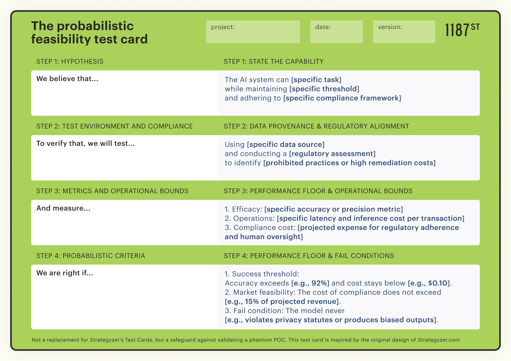 The adapted probabilistic feasibility test card explicitly structures the uncertainty of AI systems. It retains the hypothesis but modifies the execution fields to enforce precise definition around inputs and outputs.]