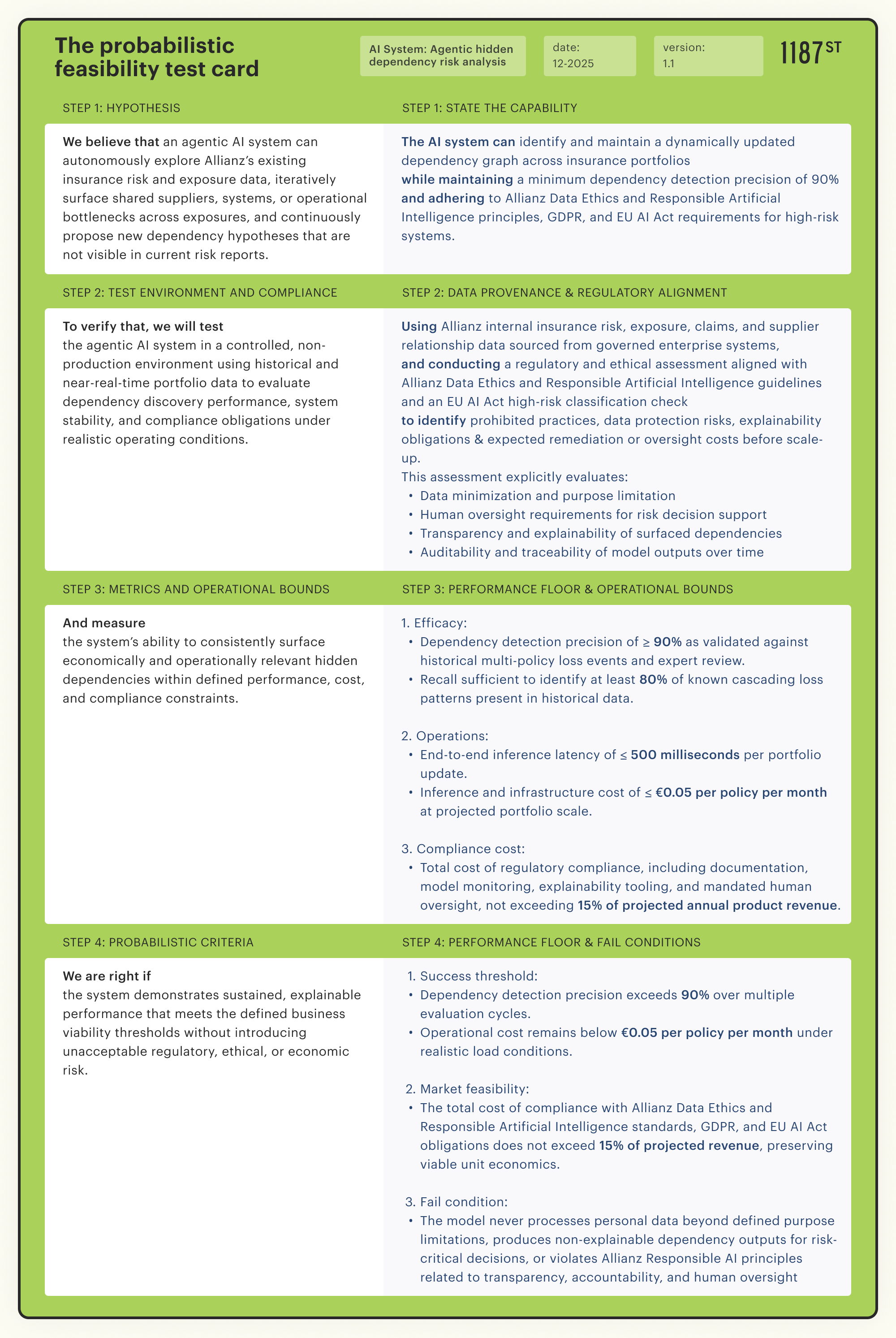The probabilistic feasibility card front-loads the question: if meeting EU AI Act explainability requirements consumes 40% of projected revenue, the business idea fails feasibility regardless of model performance.